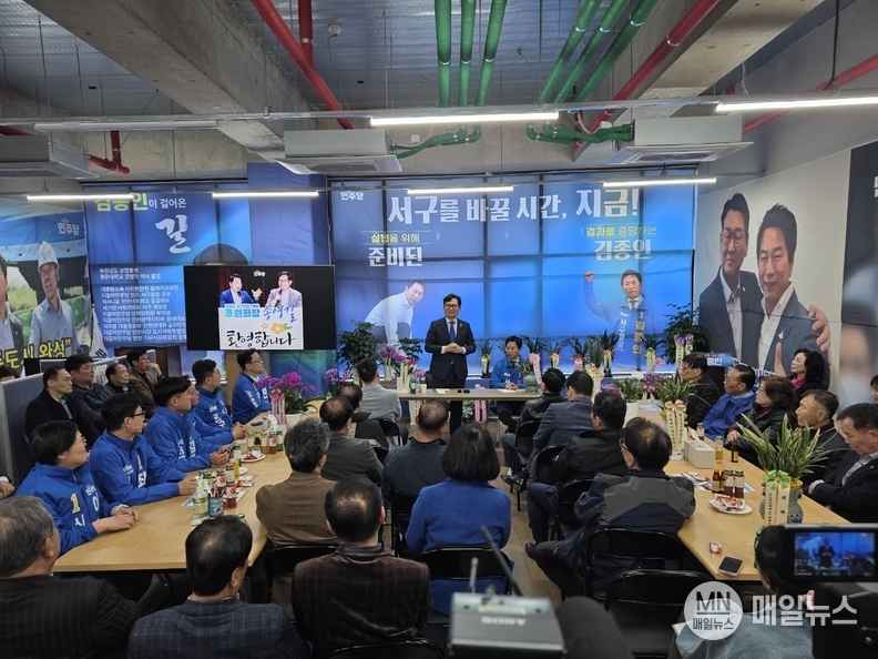 (매일뉴스=인천 서구) 조종현 기자 = 더불어민주당 前 당 대표이자 5선 국회의원인 송영길 前 인천시장이 6일 인천 서구 루원시티에 위치한 김종인 선거사무실을 전격 방문해 김종인 경선후보와 직원들을 격려하며 현장 분위기를 한껏 뜨겁게 달궜다.
