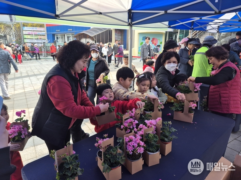행사는 자유공원, 70계단쉼터, 연안동 행정복지센터에서 오전 10시부터 11시까지 1시간가량 진행됐다. 특히 제라늄과 방울철쭉 등 초화 5,000본을 1인당 2본씩 모두 배부하며 나무 심기와 녹색 자원의 가치를 알리는 데 주력했다.