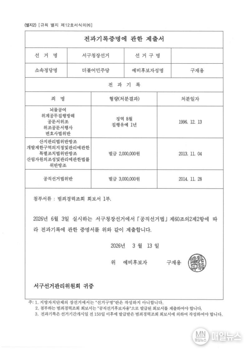 구청장은 서구의 얼굴입니다. 본선 승리를 위해서는 상대 후보의 공격으로부터 당당해야 하며, 구민들 앞에 한 점 부끄러움이 없어야 합니다. 김종인 후보는 단 한 건의 전과도 없는 청렴하고 결백한 후보입니다.