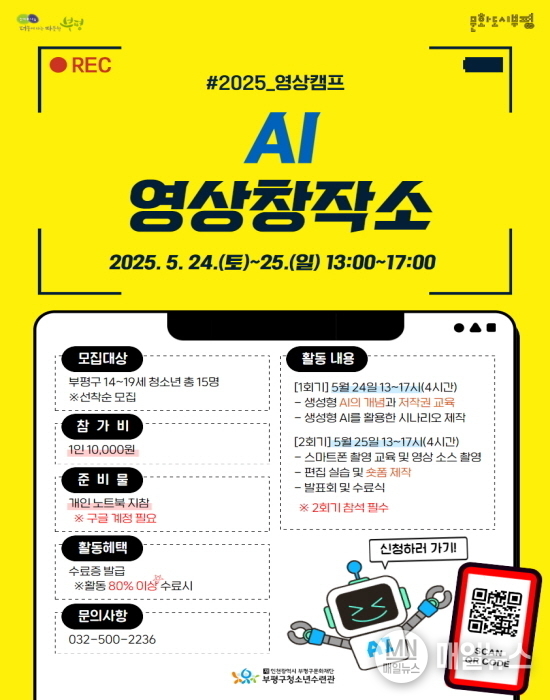 [매일뉴스] 인천 부평구(구청장 차준택) 청소년수련관이 2025 영상캠프 ‘AI 영상창작소’ 프로그램에 참여할 청소년을 오는 5월 21일까지 모집한다.