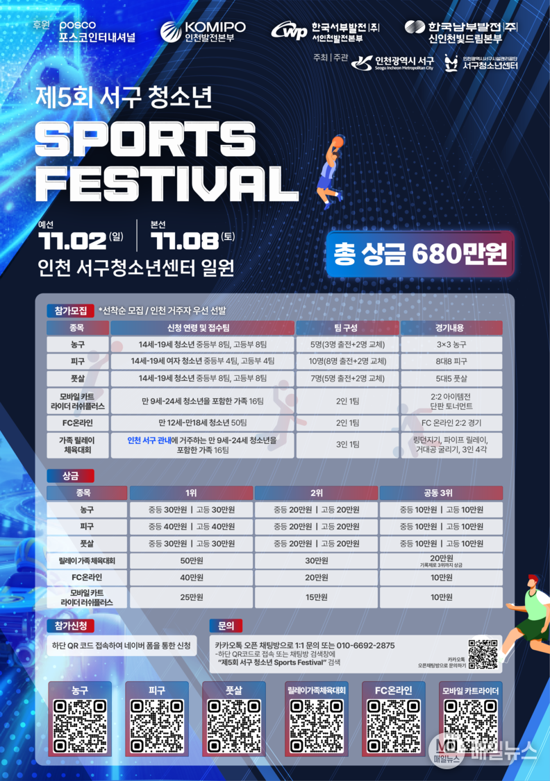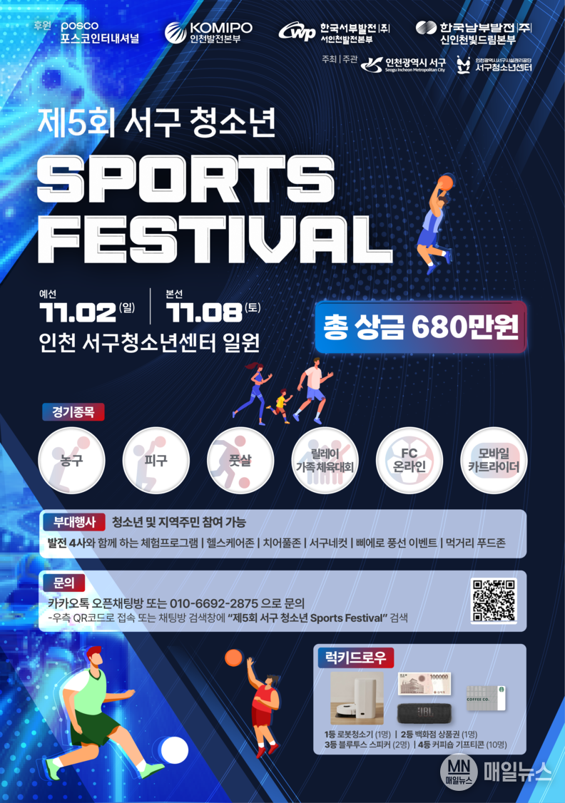 [매일뉴스] 인천 서구(구청장 강범석)가 지원하는 서구시설관리공단(이사장 우영환) 서구청소년센터가 오는 11월8일 열리는 ‘제5회 서구 청소년 스포츠 페스티벌(Sports Festival)’참가자를 모집한다.
