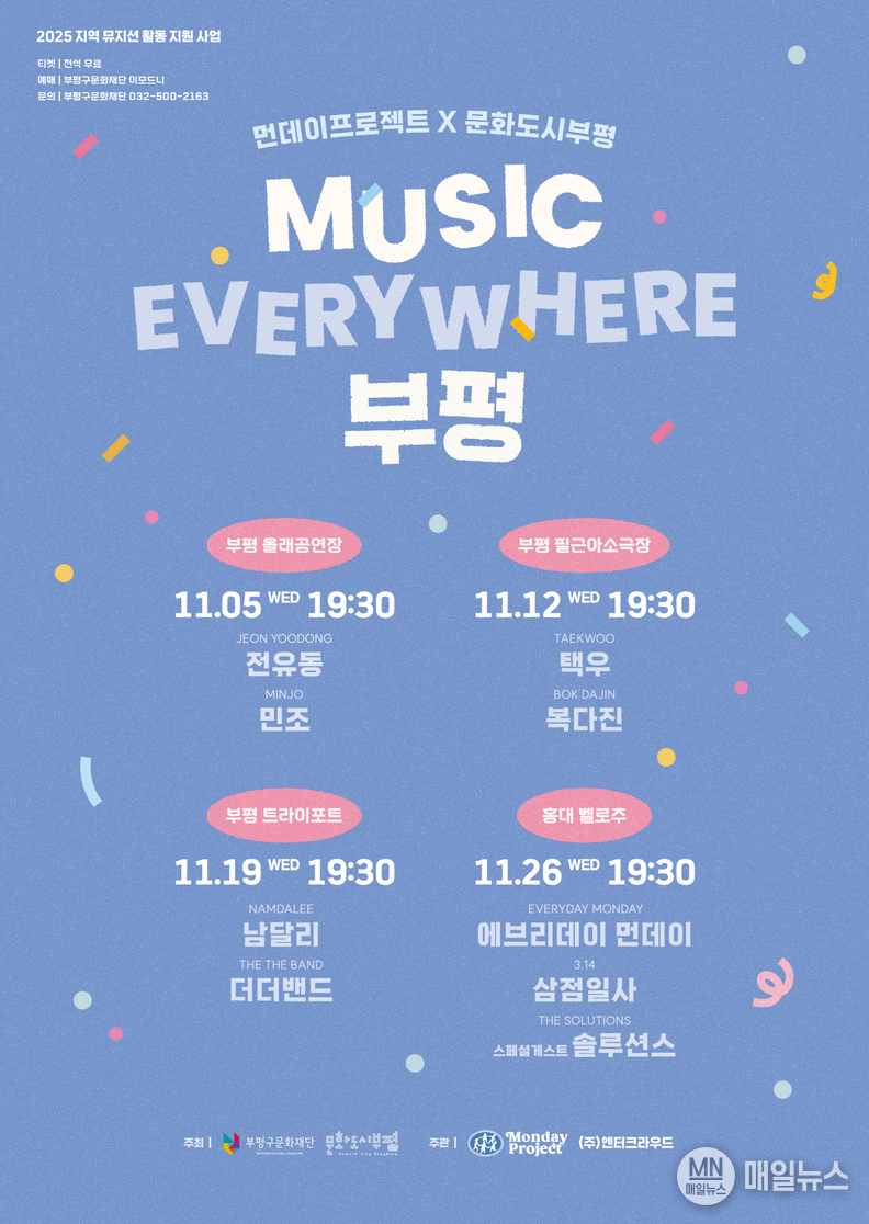 [매일뉴스] 부평구(구청장 차준택) 문화재단 문화도시센터는 오는 11월 매주 수요일 오후 7시 30분 지역 뮤지션들의 공연 ‘MUSIC EVERYWHERE 부평’을 총 4회에 걸쳐 진행한다고 밝혔다.