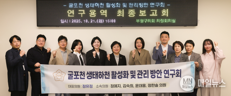 [매일뉴스] 인천 부평구의회 의원연구단체인 ‘굴포천 생태하천 활성화 및 관리 방안 연구회(대표의원: 정유정)’는 21일 부평구의회 2층 의정회의실에서 ‘굴포천 생태하천 활성화 및 관리 방안 연구’를 과업으로 하는 연구용역 최종 보고회를 개최하였다.