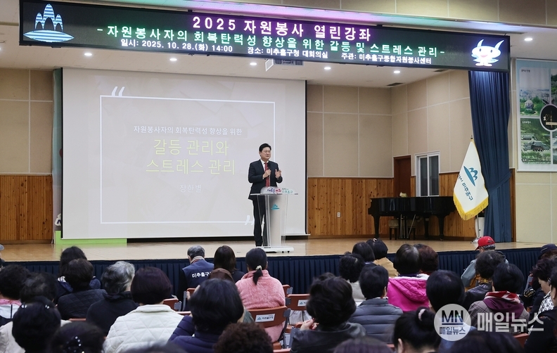 [매일뉴스] 인천 미추홀구종합자원봉사센터(센터장 유중형, 이하 센터)는 지난 28일 구청 대회의실에서 자원봉사자 200여 명을 대상으로 ‘2025 자원봉사 열린 강좌’를 진행했다.