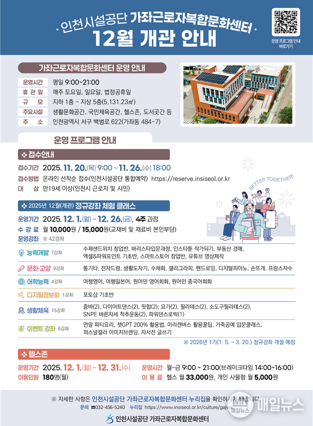 [매일뉴스] 인천시설공단(이사장 김재보)은 근로자와 시민이 함께 이용할 수 있는 복합 문화시설인 ‘가좌근로자복합문화센터’의 개관식을 26일에 개최한다.