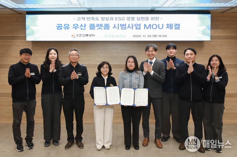[매일뉴스] 인천교통공사(사장 최정규)는 시민편의를 높이고 친환경 상생문화를 확산하기 위해 ㈜위브렐라와 ‘공유우산 플랫폼 시범사업’ 업무협약(MOU)을 체결했다고 20일 밝혔다.
