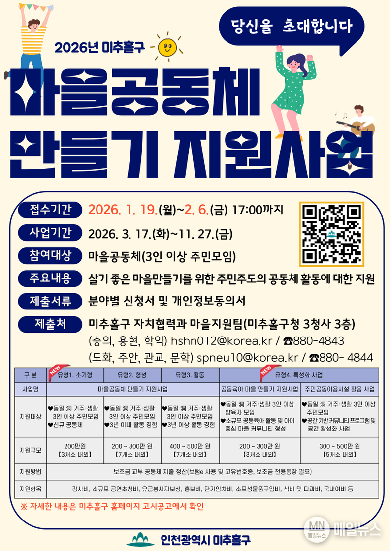 [매일뉴스] 인천 미추홀구(구청장 이영훈)는 주민 주도의 공동체 활동을 통해 살기 좋은 마을을 조성하고 주민 간 소통과 협력을 강화하고자 ‘2026년 마을공동체 만들기 지원사업’ 참여 공동체를 모집한다.