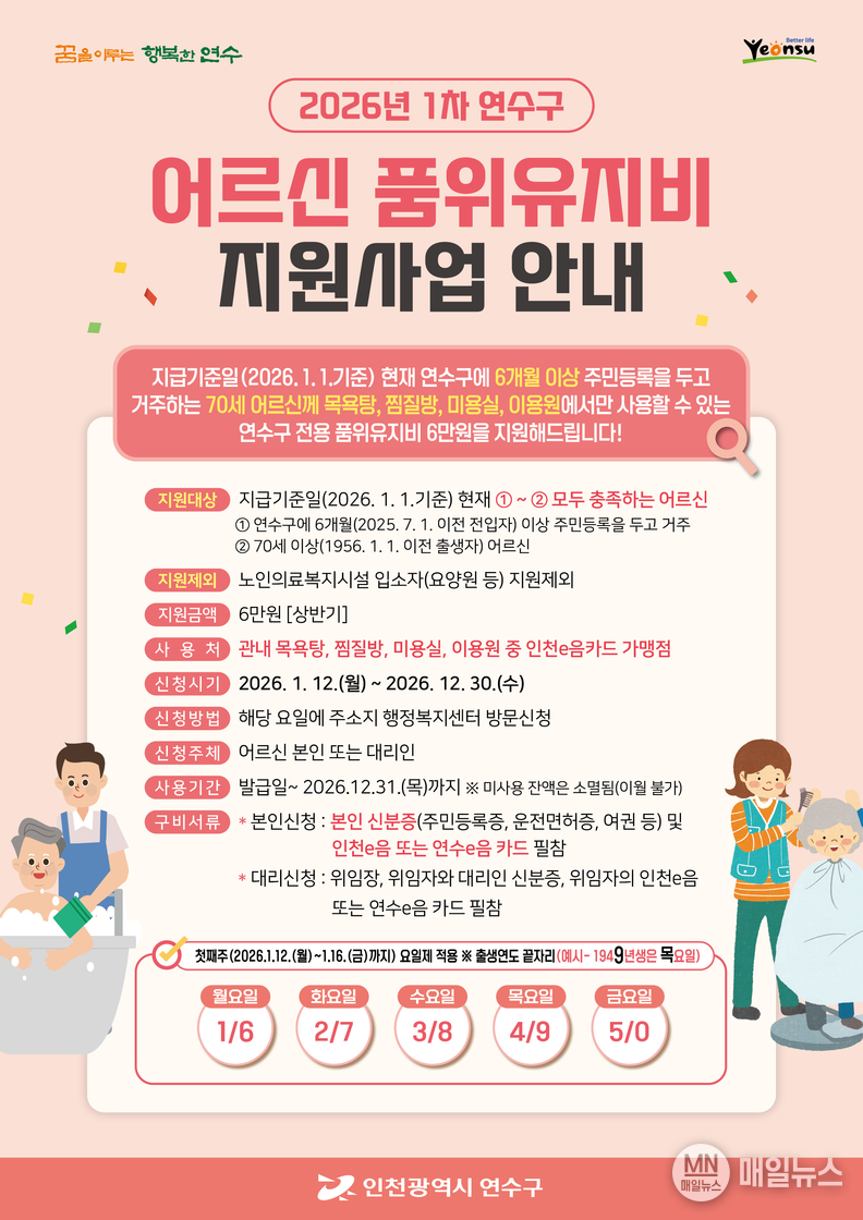 [매일뉴스] 연수구(구청장 이재호)가 병오년 새해부터 지역 내 70세 이상의 어르신들에게 연간 12만 원의 품위유지비를 지원하는 사업을 진행한다.