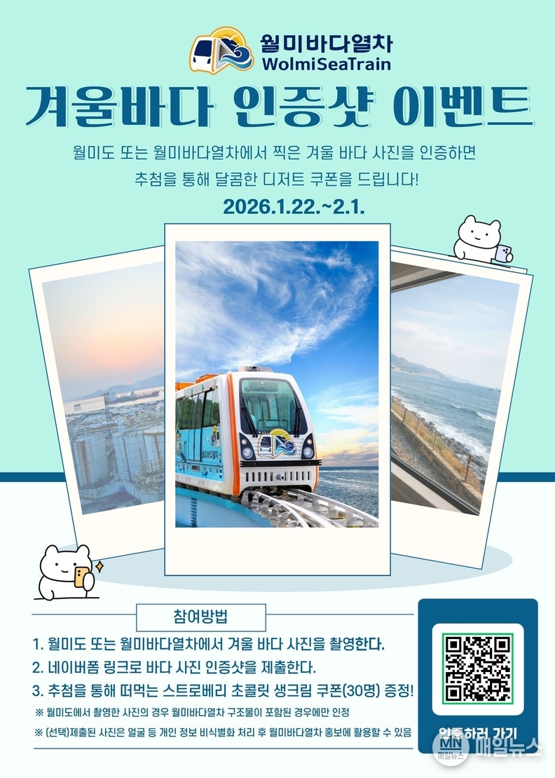 이번 이벤트는 오는 1월 22일부터 2월 1일까지 진행된다. 이벤트 기간 중 월미바다열차를 이용한 고객이라면 누구나 참여할 수 있다. 참여 방법은 월미도 일대 또는 월미바다열차 탑승 중 겨울 바다 풍경을 촬영한 뒤 안내된 네이버 폼을 통해 사진을 제출하면 된다.