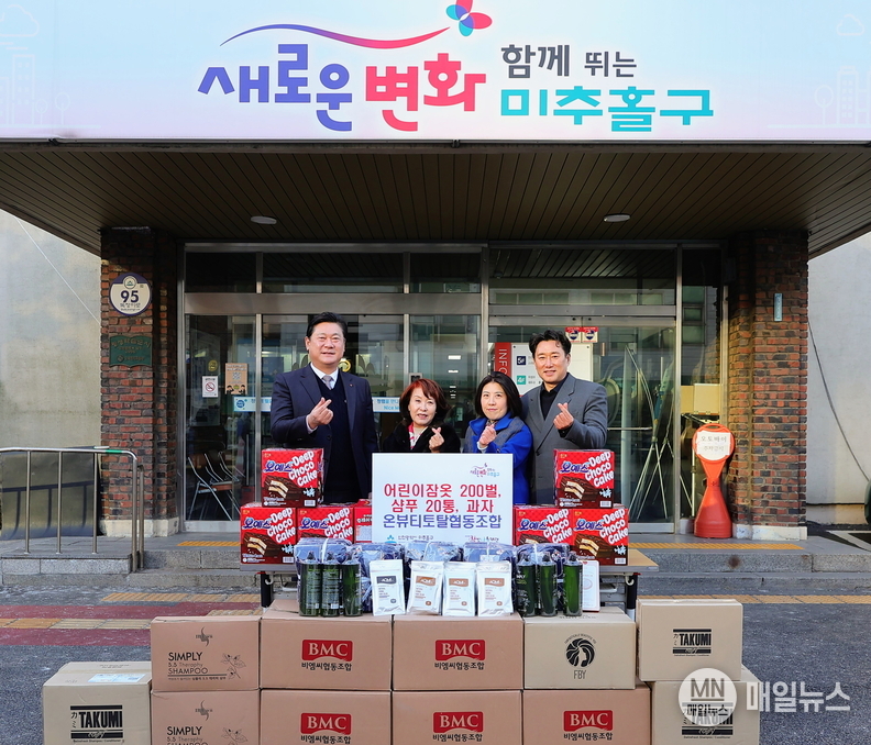 [매일뉴스] 인천 미추홀구(구청장 이영훈)는 20일 구청장실에서 온뷰티토탈협동조합(이사장 순희자)과 함께 관내 저소득층 지원을 위한 후원 물품 전달식을 가졌다.