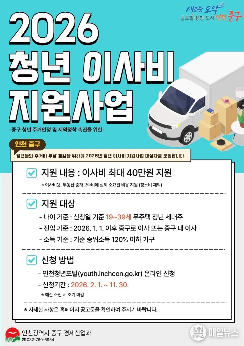 [매일뉴스] 인천시 중구(구청장 김정헌)는 청년들의 주거 안정을 돕기 위해 ‘2026년도 청년 이사비 지원사업’을 추진한다고 26일 밝혔다.