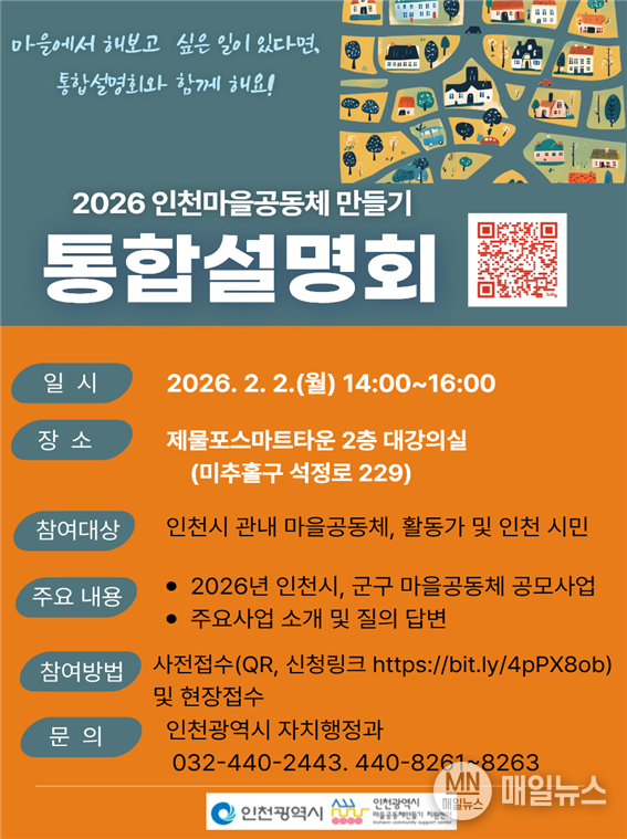 인천광역시(시장 유정복)는 2월 2일 제물포스마트타운 2층 대강의실에서‘2026년 인천광역시 마을공동체 만들기 통합설명회’를 개최한다고 밝혔다.