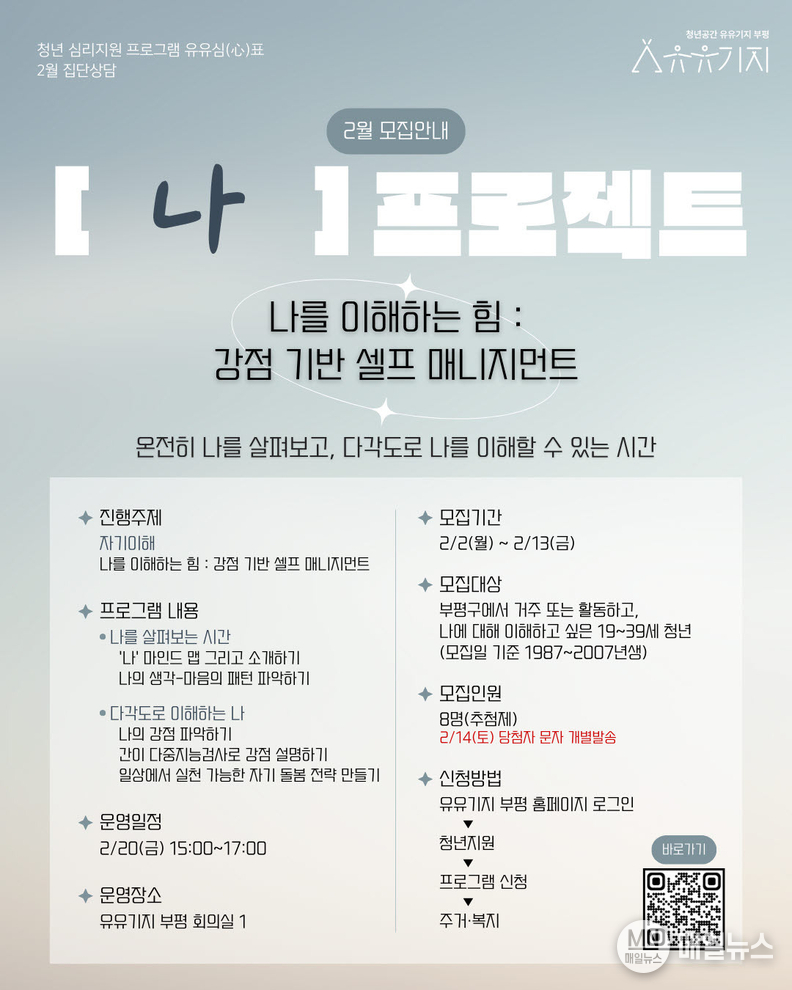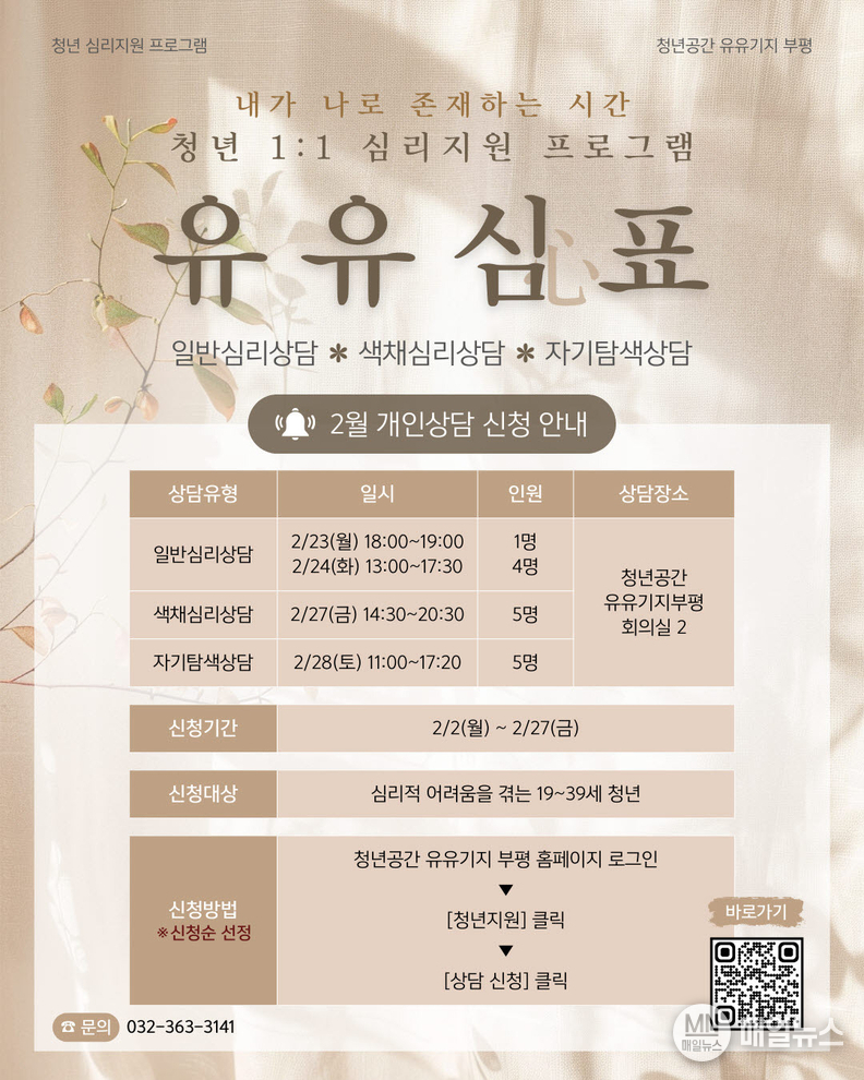 [매일뉴스] 부평구 청년공간 유유기지 부평은 청년 마음 건강 회복을 위한 심리지원 프로그램 ‘유유심(心)표’의 2월 참여자를 모집한다.