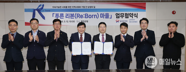 [매일뉴스] (재)옹진복지재단과 포스코A&C(사장 전훈태)는 지난 3월 12일 농어촌 지역과 기업의 상생 협력을 통해 지역공동체 활성화를 위한 ‘푸른 리본(Re:Born) 마을’업무협약을 체결했다.