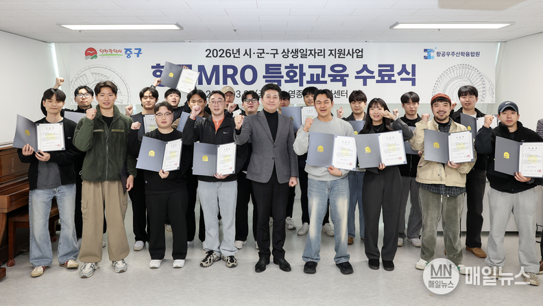 [매일뉴스] 인천시 중구(구청장 김정헌)는 지난 27일 영종복합문화센터에서 지역 전략 산업인 항공산업의 미래를 짊어질 인재 양성 과정인 ‘내일(Future/My job)을 위한 청년 항공 MRO 특화교육’의 수료식을 성황리에 개최했다.