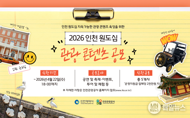 [매일뉴스] 인천광역시(시장 유정복, 이하 인천시)와 인천관광공사(사장 유지상, 이하 공사)는 오는 4월 22일까지 원도심의 숨은 매력을 발굴하기 위한‘2026 인천 원도심 관광 콘텐츠 공모’를 실시한다고 밝혔다.