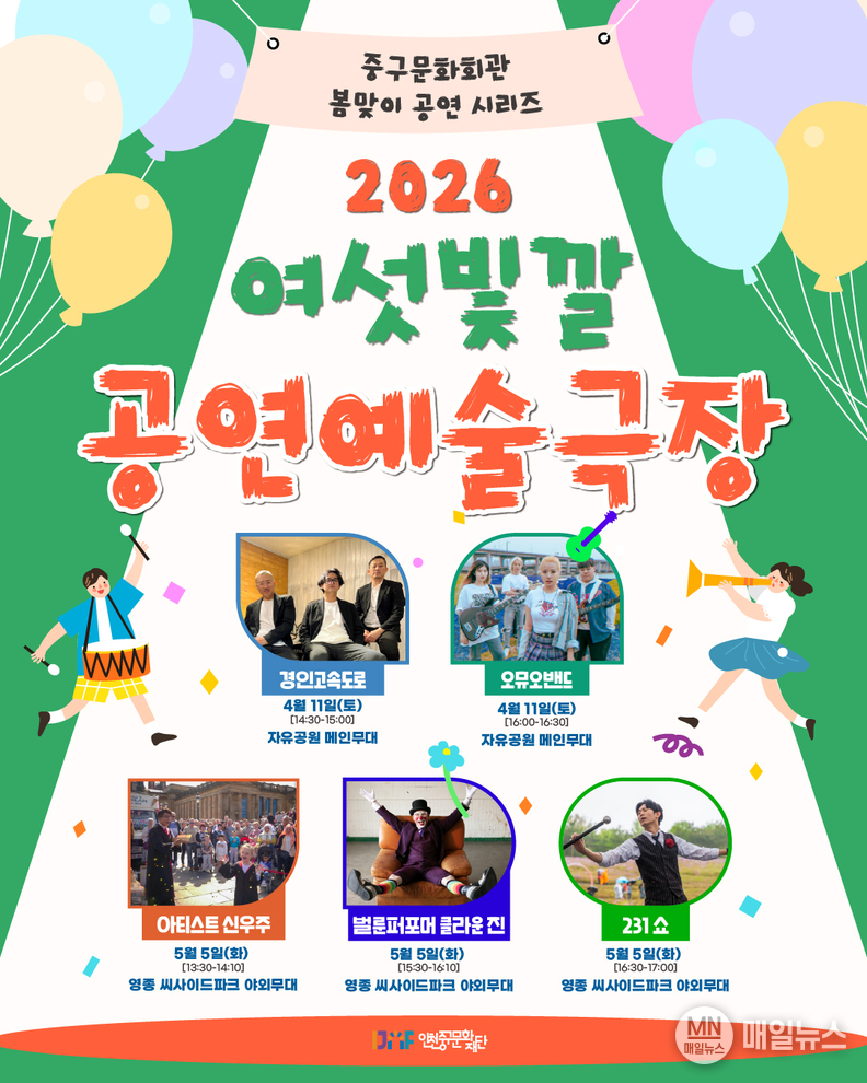 [매일뉴스] (재)인천중구문화재단(이사장 김정헌)은 시민과 함께하는 중구문화회관 봄맞이 공연 시리즈 ‘2026 여섯빛깔 공연예술극장’을 오는 4월부터 5월까지 총 5회에 걸쳐 선보인다고 밝혔다.