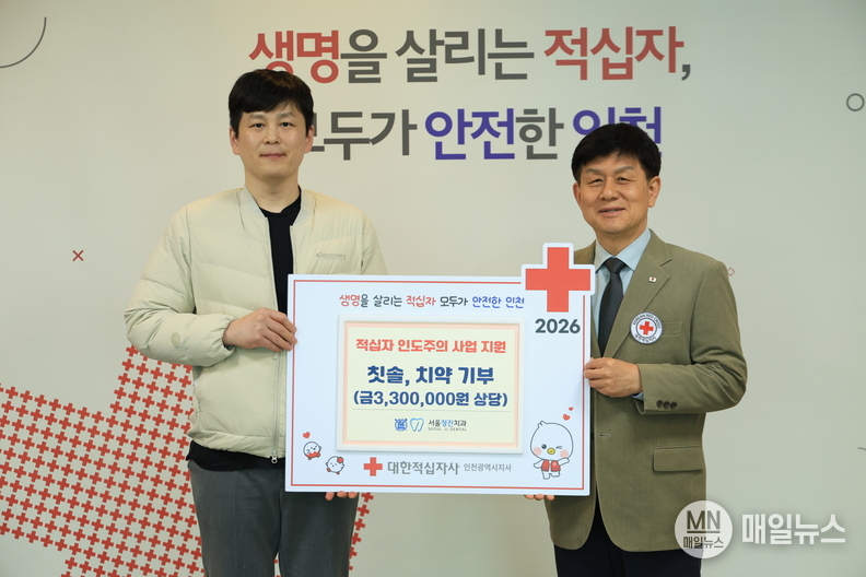 [매일뉴스] 대한적십자사 인천지사(회장 조의영)는 서울정진치과(대표원장 이정진)이 지역사회 취약계층의 구강위생을 위하여 기부물품을 전했다고 16일 밝혔다.
