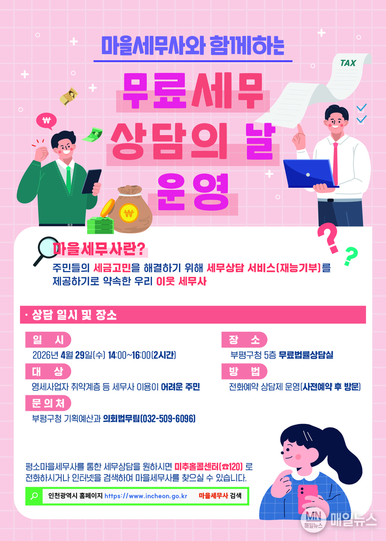 [매일뉴스] 부평구는 오는 29일 구청 5층 무료법률상담실에서 마을세무사와 함께하는 ‘무료 세무 상담의 날’을 운영한다.