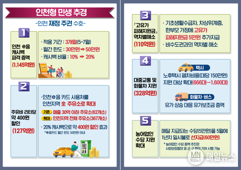 먼저 지역 소비 활성화를 위한 인천e음 캐시백 확대 정책은 5월부터 7월까지 3개월간 시행될 예정이다. 캐시백 비율은 기존 10%에서 20%로 두 배 확대되고, 월 구매 한도도 30만 원에서 50만 원으로 상향된다.