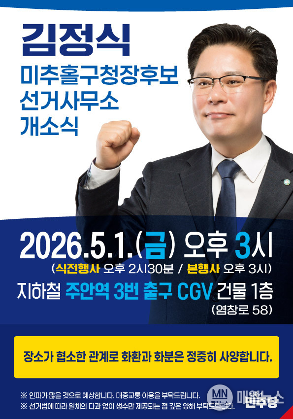 김정식 후보 선거사무소에 따르면 이번 개소식은 오는 5월 1일(금) 오후 3시, 미추홀구 염창로 58 주안CGV 건물 1층에서 개최될 예정이다. 개소식에는 지역 주민과 지지자, 관계자 등이 참석해 선거 승리를 위한 결의를 다지는 자리가 될 전망이다.