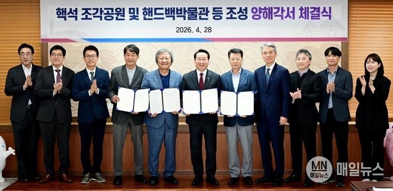 인천광역시(시장 유정복)는 4월 28일 인천시청 대접견실에서 조각가, ㈜시몬느, 블루코어PFV㈜와 ‘핵석 조각공원과 핸드백 박물관·핵석 전시관 조성’을 위한 양해각서를 체결했다.