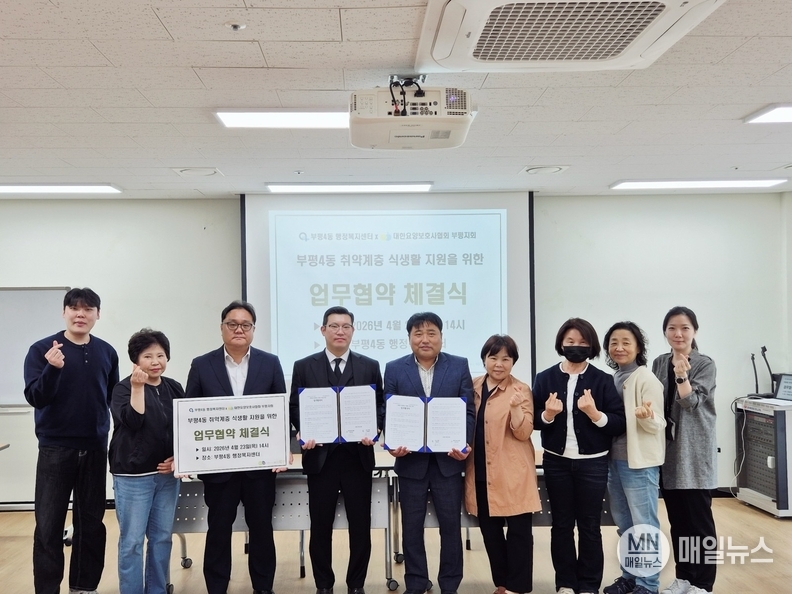 [매일뉴스] 부평구 부평4동은 지난 27일 대한요양보호사협회 부평지회와 취약계층 식생활 지원을 위한 업무협약을 체결했다고 밝혔다.