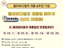[매일뉴스] 인천교통공사(사장 최정규)는 월미바다열차 개통 6주년을 맞아 오는 10월 1일부터 12일까지 고객감사 퀴즈 이벤트를 진행한다고 30일 밝혔다. 월미바다열차는 2019년 10월 개통 이후 인천의 대표 관광명소로 자리매김했으며, 시민과 관광객의 성원에 힘입어 지난 2월 누적 이용객 100만 명을 돌파하는 성과를 달성했다. 이번 이벤트는 승강장 포스터의 QR코드 또는 인천교통공사 카카오톡 안내를 통해 네이버폼에 접속해 퀴즈를 풀면 참여할 수 있다. 정답자 중 추첨을 통해 교촌치킨 허니콤보 세트, 스타벅스 기프티콘 등 다양한 경품이 제공된다. 최정규 인천교통공사 사장은 “월미바다열차를 사랑해주신 시민과 관광객 여러분께 깊이 감사드린다”며, “앞으로도 다양한 이벤트와 홍보 활동으로 월미바다열차의 매력을 널리 알리고, 지역 상권과 함께 성장할 수 있도록 최선을 다하겠다”고 말했다.