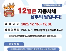 [매일뉴스] 인천 서구(구청장 강범석)는 2025년 12월 정기분 자동차세 15만 3천599건, 198억여 원을 부과하고 11일 고지서를 일괄 발송했다고 밝혔다. 자동차세는 차종에 따른 일정액이나 배기량에 cc당 세액을 곱해 산출하는 차량별 연세액을 기준으로 1년에 상·하반기로 나누어 2회(6월, 12월) 정기적으로 부과한다. 이번 12월 정기분 자동차세는 7월 1일부터 12월 31일까지 소유 기간에 대한 부과분으로 과세기준일(12월 1일) 현재 자동차 등록 원부상 서구에 등록된 차량(자동차, 이륜차, 기계장비) 소유자에게 부과된다. 자동차세 연세액을 미리 선납한 차량과 연세액이 10만 원 이하로 6월에 일괄 부과된 차량은 제외된다. 고지서는 우편으로 발송되며 전자고지 신청자는 전자우편 또는 모바일앱에서 확인할 수 있다. 납부 기간은 12월 16일부터 12월 31일까지다. 자동차세는 전국 금융기관 ATM/CD기, 위택스(www.wetax.go.kr), 지로(www.giro.or.kr) 등 인터넷, 보이는 ARS(142-211)를 통해 조회·납부가 가능하며 지방세입 계좌 및 가상계좌로 이체할 수 있다. 고지서를 받지 못했거나 분실했을 경우 전국 금융기관 ATM