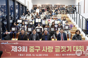 [매일뉴스] 인천시 중구(구청장 김정헌)는 지난 16일 중구 평생학습관 3층 책뜰에서 ‘제3회 중구 사랑 글짓기 대회 시상식’을 개최했다. 올해로 3회를 맞는 ‘중구 사랑 글짓기 대회’는 학생들 스스로 발로 걸으며, 눈으로 본 중구의 역사, 문화, 자연을 아름다운 글로 표현함으로써, 애향심을 고취하고 인문학적 소양을 키울 수 있도록 돕는 데 목적을 둔 사업이다. 특히 인천시 교육청의 ‘읽·걷·쓰 캠페인’과 연계한 중구 교육혁신지구 특화 사업인 ‘중구마을 구석구석 탐방 사업’의 결실이기도 하다. 올해 대회에는 학생들의 맑은 시선으로 바라본 중구의 거리, 유구한 역사가 깃든 건축물, 바다 내음 가득한 풍경들을 다양한 형식의 글로 표현한 300여 점의 작품이 접수됐다. 치열한 심사 끝에 대상 4명, 최우수 8명, 우수 8명 등 총 20명(초등 부문 10명, 중등 부문 10명)의 입상자가 선정됐다. 시상식 말미에는 초등 부문 대상 입상자인 정은우 학생이 본인의 글짓기 작품인 ‘나의 중구 사랑 이야기’를 직접 낭독함으로써, 진정성 있는 울림을 통해 현장에 있던 관계자와 학부모들의 감탄을 자아냈다. 김정헌 구청장은 입상자들에게 축하의 인사를 전하며 “아름다운 글로 우리