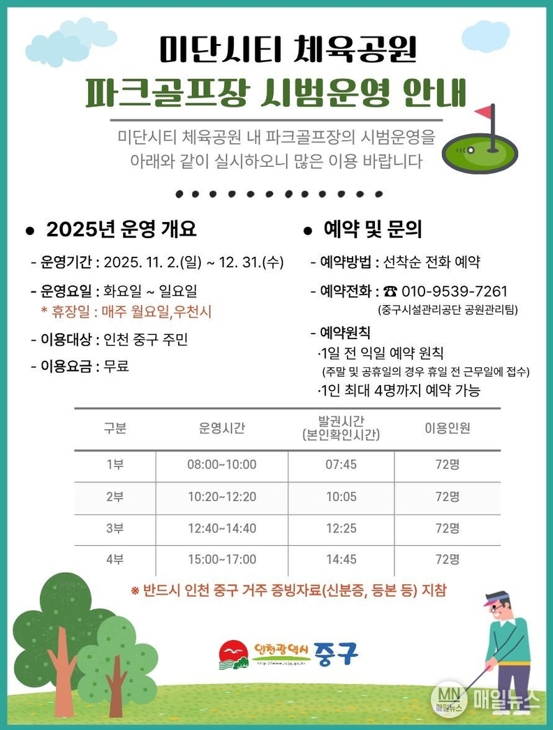 [매일뉴스] 인천시 중구(구청장 김정헌)는 미단시티 체육공원 내에 ‘파크골프장’을 새로 조성하고, 오는 11월 2일부터 시범운영에 들어간다고 밝혔다.