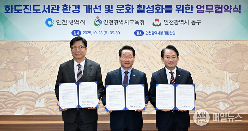 [매일뉴스] 인천시(시장 유정복)는 인천광역시교육청(교육감 도성훈), 인천광역시 동구(구청장 김찬진)와 함께 10월 23일 인천시청에서 ‘화도진도서관 증·개축 추진을 위한 업무협약’을 체결했다고 밝혔다.