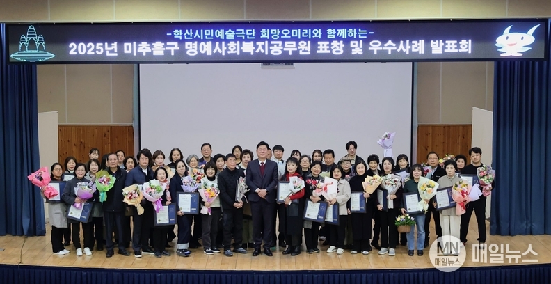 [매일뉴스] 인천 미추홀구(구청장 이영훈)는 18일 구청 대회의실에서 명예사회복지공무원과 업무 담당자 등 150여 명이 참석한 가운데 ‘2025년 명예사회복지공무원 표창 및 우수 활동 사례발표회’를 개최했다.