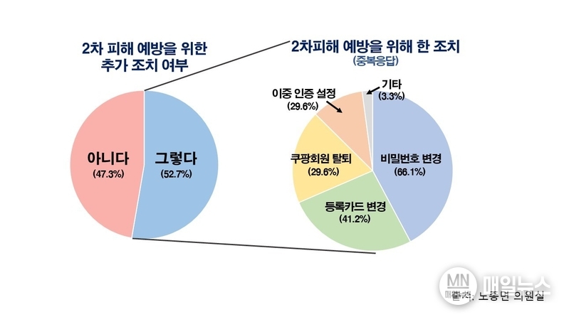 개인정보 유출의 2차 피해 예방을 위해서 추가 조치를 한 응답자는 절반 가량인 52.7%로 집계됐다. 복수 응답으로 조사한 결과, 추가 조치를 진행한 응답자의 66.1%는 비밀번호를 변경했다. 등록카드를 변경하거나 쿠팡회원을 탈퇴한 응답자도 각각 41.2%, 29.6%로 확인됐다.