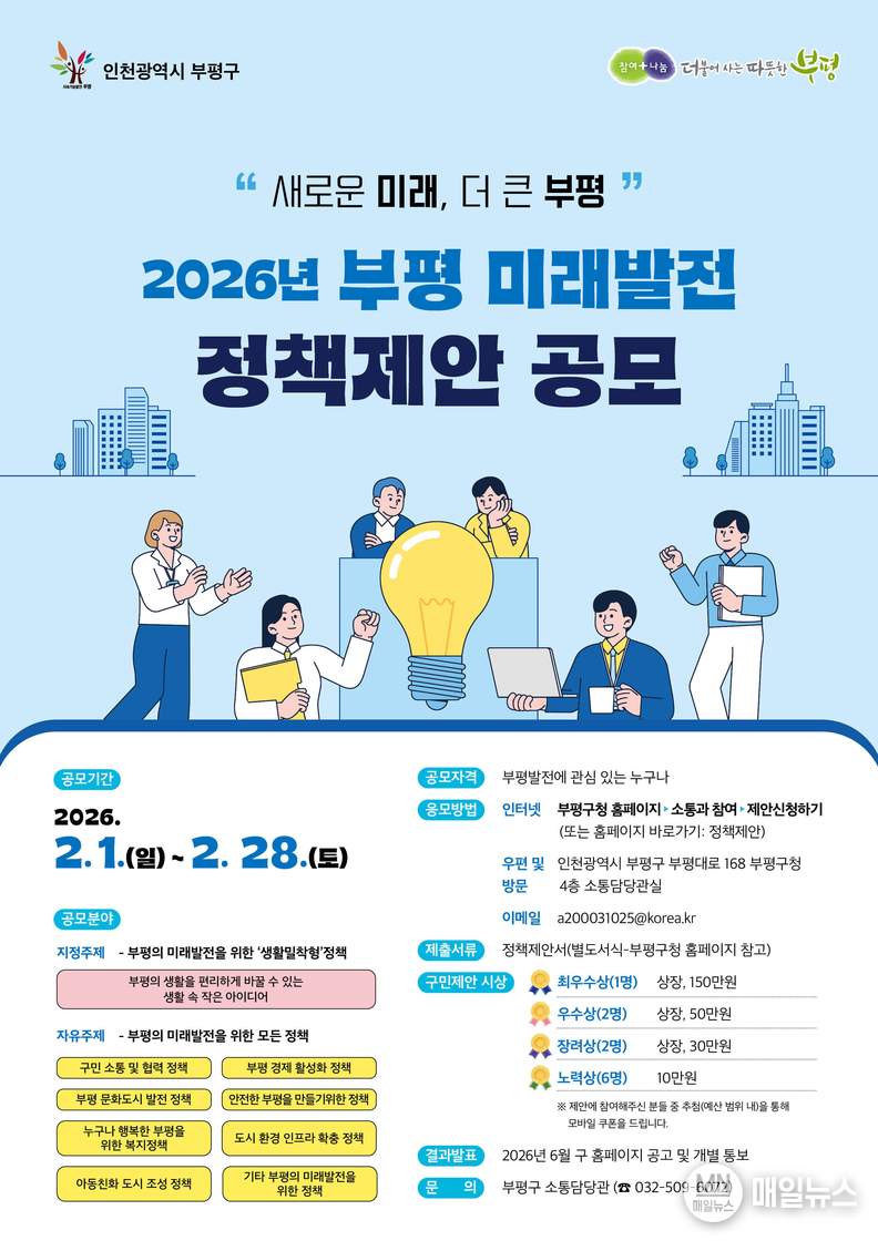 [매일뉴스] 부평구는 2026년도 ‘부평 미래발전 정책 제안 공모’를 2월 한 달간 실시한다. 이번 공모는 ‘새로운 미래, 더 큰 부평’을 부제로, 정책 수립과 결정 과정에 구민 참여를 확대하고 다양한 의견을 반영해 행정의 투명성을 높이기 위해 마련됐다.