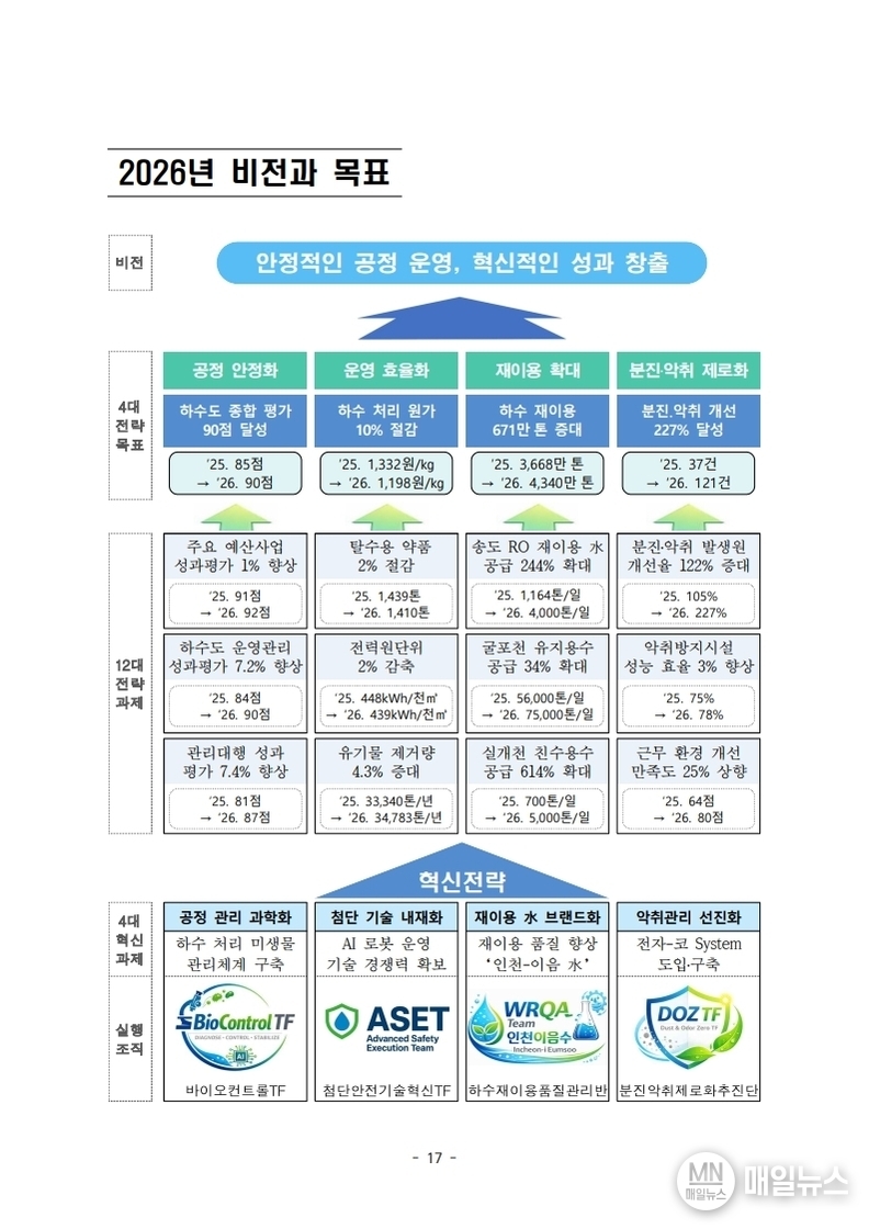 [매일뉴스] 인천환경공단(이사장 김성훈)은 12일 창립 19주년을 맞아 20년 차의 새로운 출발점에서, 2026년 물 환경 분야 비전을‘안정적인 공정 운영, 혁신적인 성과 창출’로 설정하고 이를 실행하기 위한‘2026 물 환경 종합 운영계획’발표했다.