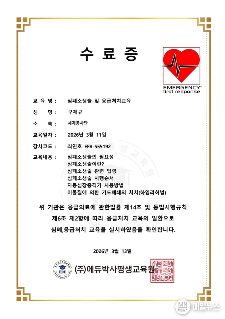 세계봉사단은 지속적인 교육을 통해 응급처치 역량 강화에도 힘쓰고 있다. 단체는 2025년 1차 교육에서 20명의 수료생을 배출한 데 이어, 2026년 2차 교육에서는 16명의 수료생을 배출했다.