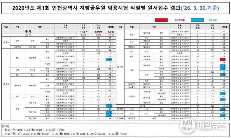 인천광역시(시장 유정복)는 2026년도 제1회 지방공무원 임용시험 원서접수를 3월 23일부터 27일까지 진행한 결과, 총 1,537명 선발 예정에 총 6,980명이 지원해 평균 경쟁률 4.5대 1을 기록했다고 밝혔다.