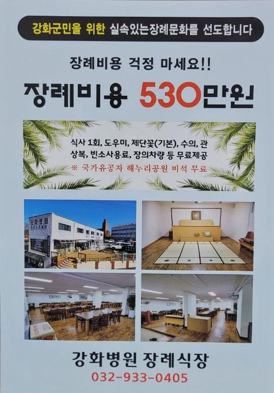 (매일뉴스=강화)지창호기자 = 강화병원 장례식장(대표 김군실)은 강화군민을 위한 정직하고 실속 있는 장례비용을 선보인다고 밝혔다.
