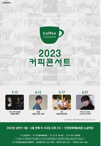 [매일뉴스] 인천광역시는 2008년에 시작해 누적 관객 8만 6천 명을 돌파하며 인천의 대표 브랜드 공연으로 자리매김한 '커피콘서트'가 2023년 3월부터 6월까지 총 4회 차의 라인업을 공개한다고 밝혔다.매달 한 번, 셋째 주 수요일 오후 2시에 열리는 '커피콘서트'는 향긋한 커피 한 잔과 함께 다양한 장르의 무대를 만나는 마티네 콘서트(Matinée Concert)이다.