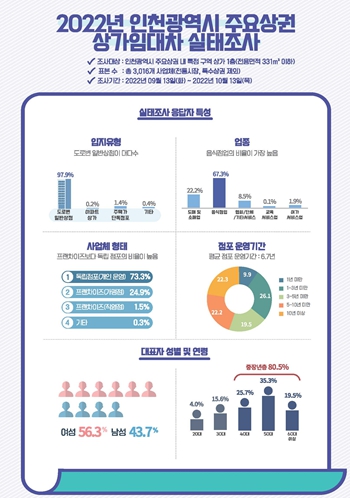 ‘2022년 인천시 상가 임대차 실태조사 결과’는 ‘인천시 소상공인서민금융복지지원센터’에 공개해 임대인과 임차인 간 정보 비대칭 문제를 완화하고 시민들이 임대료 산정 시 참고자료로 활용할 수 있도록 할 예정이다.
