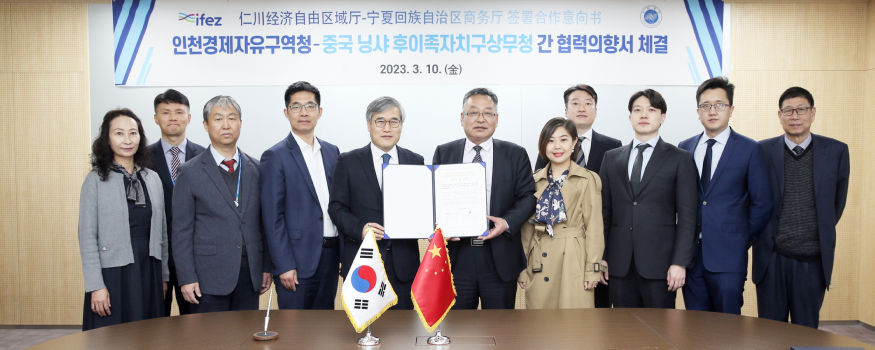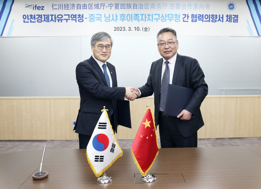 (매일뉴스=인천경제청) 이형재 기자 = 인천경제자유구역청은 10일 송도국제도시 G타워에서 김진용 청장과 츄이엔샹(崔彦祥) 중국 닝샤 후이족 자치구(宁夏回族自治区) 상무청 부청장 등이 참석한 가운데 상호 협력 업무협약을 체결했다고 밝혔다.
