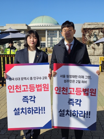 [매일뉴스] “인천시민의 헌법상 기본권 보장하라.”인천광역시의회 행정안전위원회 소속 이단비(국·부평3)·신성영(중구2) 의원은 인천고등법원 관련 법률안 통과를 촉구하는 여론이 확산하는 가운데 최근 국회의사당 앞에서 1인 시위를 벌였다고 14일 밝혔다.