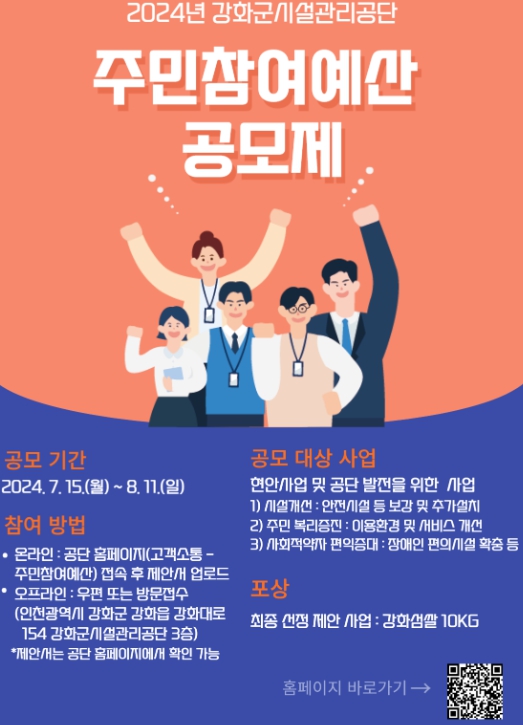 [매일뉴스] 강화군시설관리공단은 주민과 이용 고객을 대상으로 ‘2024년 주민참여예산 공모’를 실시한다고 밝혔다.