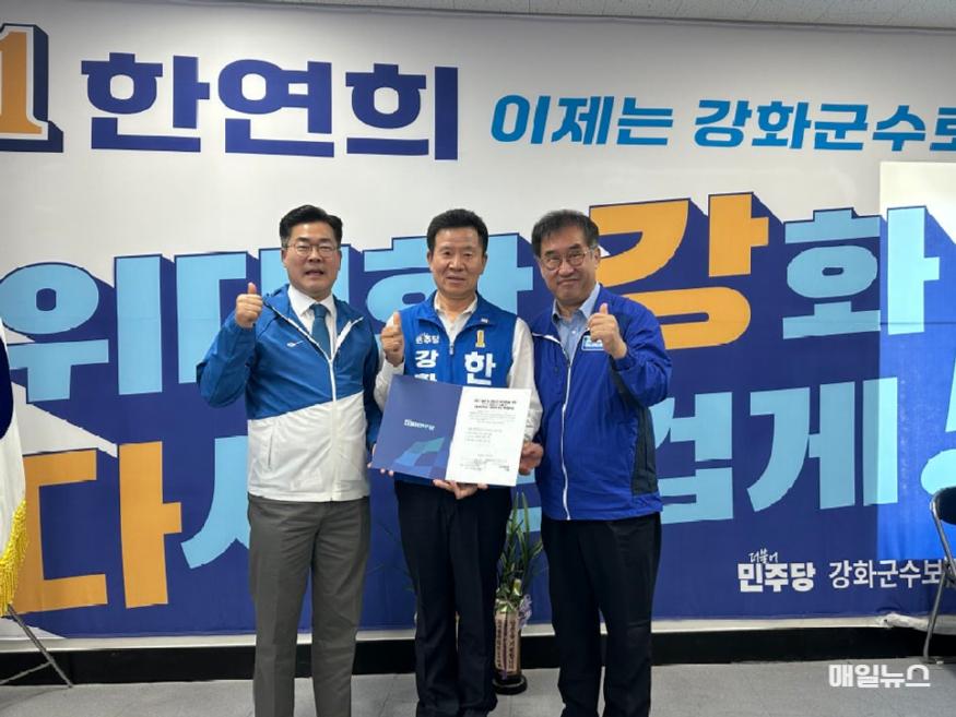 [매일뉴스] 한연희 강화군수 후보(더불어민주당)는 10월 3일 오전8시, 선거사무소에서 더불어민주당 박찬대 원내대표, 국회 국토교통위원회 맹성규 위원장과 강화군 교통,도로 분야 정책협약식을 가졌다.