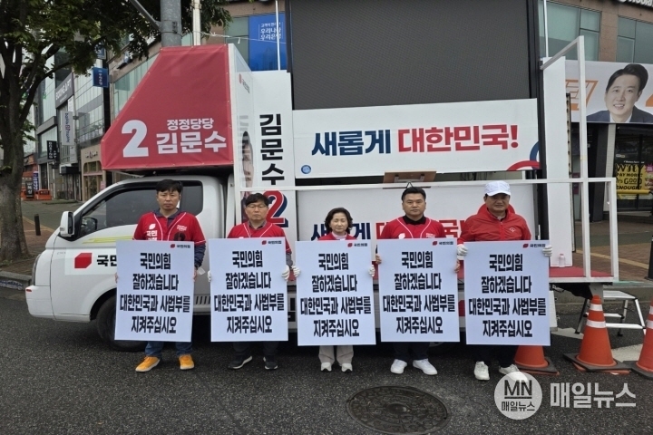 국민의힘 당협위원장들과 선거운동원들은 유세차량 무대에서 내려와 피켓을 든 채 침묵 속에서 시민들과 눈을 맞췄다. 피켓에는 “국민의힘이 잘하겠습니다. 대한민국과 사법부를 지켜주십시오”라는 문구가 적혀 있었다.