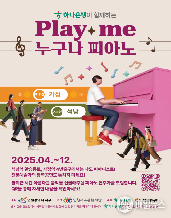[매일뉴스] 지하철 퇴근길, 피아노 선율이 바쁜 하루를 위로한다. 인천서구문화재단(대표이사 정인서)은 오는 6월 5일(수), 인천지하철 2호선과 서울지하철 7호선이 만나는 석남역 환승통로에서 ‘Play me, 누구나 피아노’ 오프닝 공연을 개최한다고 밝혔다.