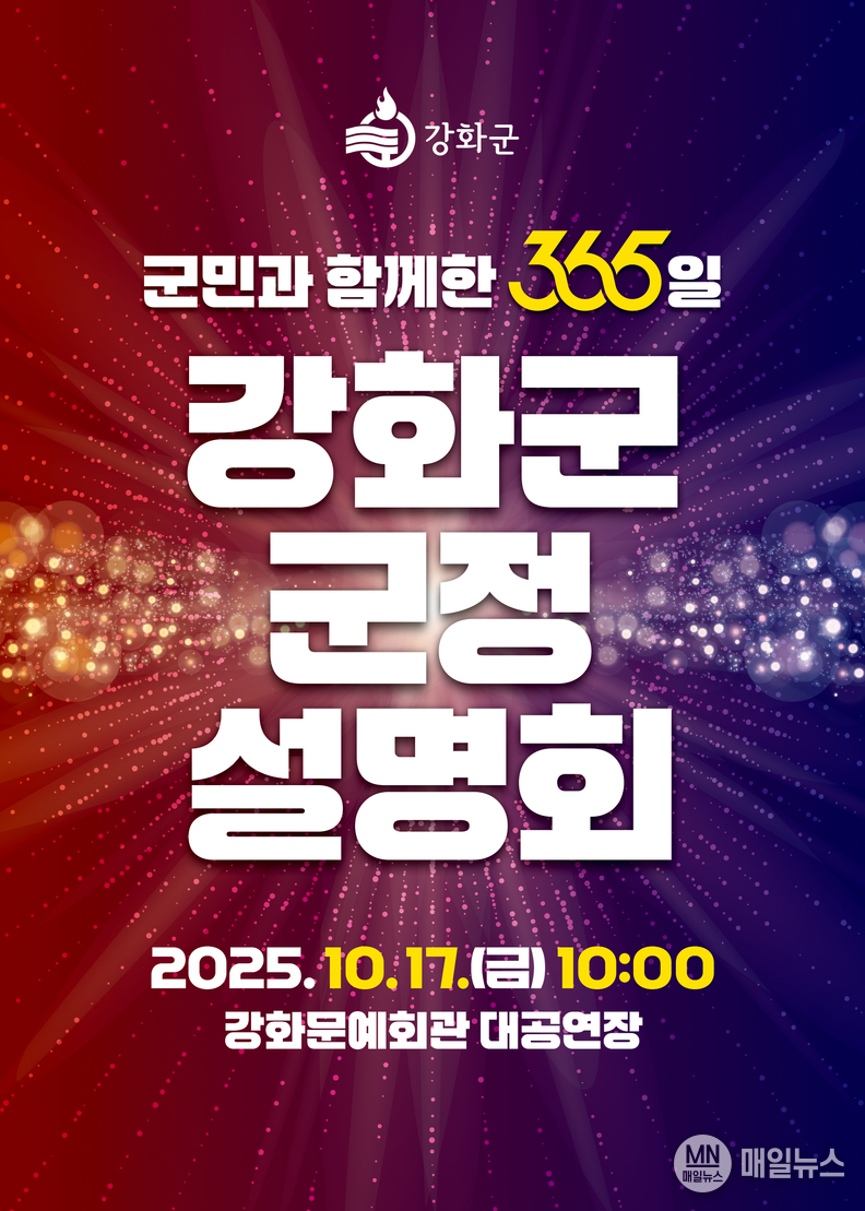 [매일뉴스] 강화군(군수 박용철)은 오는 10월 17일(금) 오전 10시 강화문예회관에서 “군민과 함께한 365일, 강화군 군정 설명회”를 개최한다.