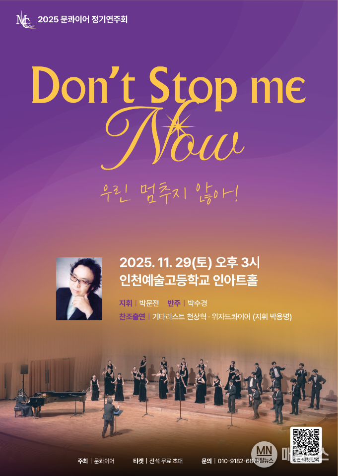 [매일뉴스] 음악으로 희망과 감동을 전해온 문콰이어가 오는 29일 오후 3시, 인천예술고등학교 인아트홀에서 ‘Don’t Stop Me Now’라는 슬로건 아래 2025년 정기연주회를 개최한다.