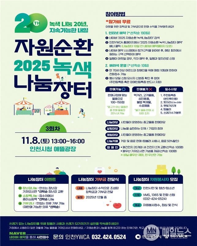인천광역시(시장 유정복)는 인천시민의 탄소중립 실천과 나눔 문화 확산을 위한 대표 시민참여형 축제인 ‘2025 자원순환 녹색 나눔장터(이하 나눔장터)’가 11월 8일(토) 인천애(愛)뜰 광장에서 폐장식을 겸한 3회차 행사를 끝으로 올해 일정을 마무리했다고 밝혔다.